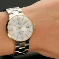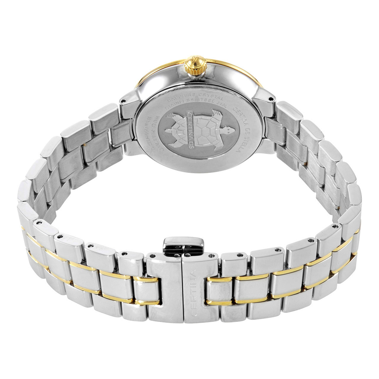 Корпус: Корпус из полированной/матовой нержавеющей стали с частичным PVD покрытием. Перламутровый циферблат украшен камнями и радиальным декоративным узором. Листовидные стрелки в стиле Feuille. Метки в виде римских цифр и штрихов. Рифленая заводная головка. Задняя крышка с гравировкой. Сапфировое стекло с антибликовым покрытием. Диаметр 32 мм. Водостойкость 100 м. Система DS.