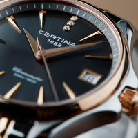 Корпус: Корпус из нержавеющей полированной/матовой стали, безель с PVD - покрытием розового цвета. Серый циферблат украшен тримя бриллиантами. Стрелки и риски золотистого цвета. Сапфировое стекло с антибликовым покрытием. Диаметр 33,8 мм. Водостойкость 200 м.