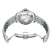 Корпус: Корпус модели выполнен из высококачественной стали марки 316L с повышенной устойчивостью к коррозии, поверхности с матовой шлифовкой – сатинированием и полировкой до зеркального блеска. Чёрный циферблат украшен 8 бриллиантами цвета Top Wesselton. Одностороннее антибликовое покрытие сапфирового стекла. Прозрачная задняя крышка. Диаметр: 34,5 мм. Водостойкость: 200 м.
