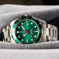 Корпус: Корпус из нержавеющей стали. Вращающийся безель с PVD-покрытием зеленого цвета. Покрытие Superluminova на стрелках и часовых метках. Сапфировое стекло с антибликовым покрытием. Зеленый циферблат. Диаметр 43 мм. Водонепроницаемость 300 метров.