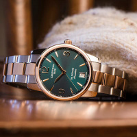 Корпус: Корпус из полированной/матовой нержавеющей стали с PVD - покрытием золотом. Зеленый циферблат с золотистыми стрелками и часовыми индексами. Сапфировое стекло. Диаметр 33 мм. Водостойкость 100 м. Система DS.
