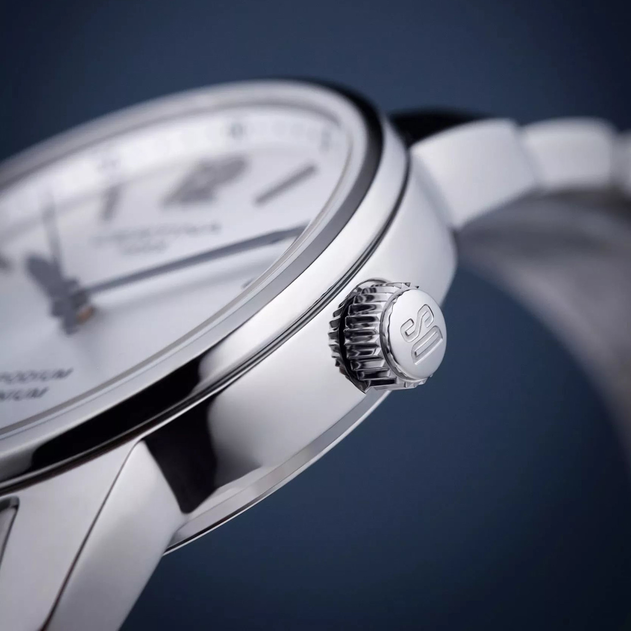 Корпус: Корпус выполнен из титана, который имеет высокую прочность и устойчивость к коррозии. Циферблат серебристого цвета выполнен в технике sunray, создающей эффект переливающихся лучей. Часовые индексы и стрелки выполнены из стали. Сапфировое стекло с антибликовым покрытием, устойчивое к повреждениям и обеспечивающее чёткую видимость при любом освещении. Диаметр корпуса составляет 33 мм. Водонепроницаемость WR 100 (плавание).