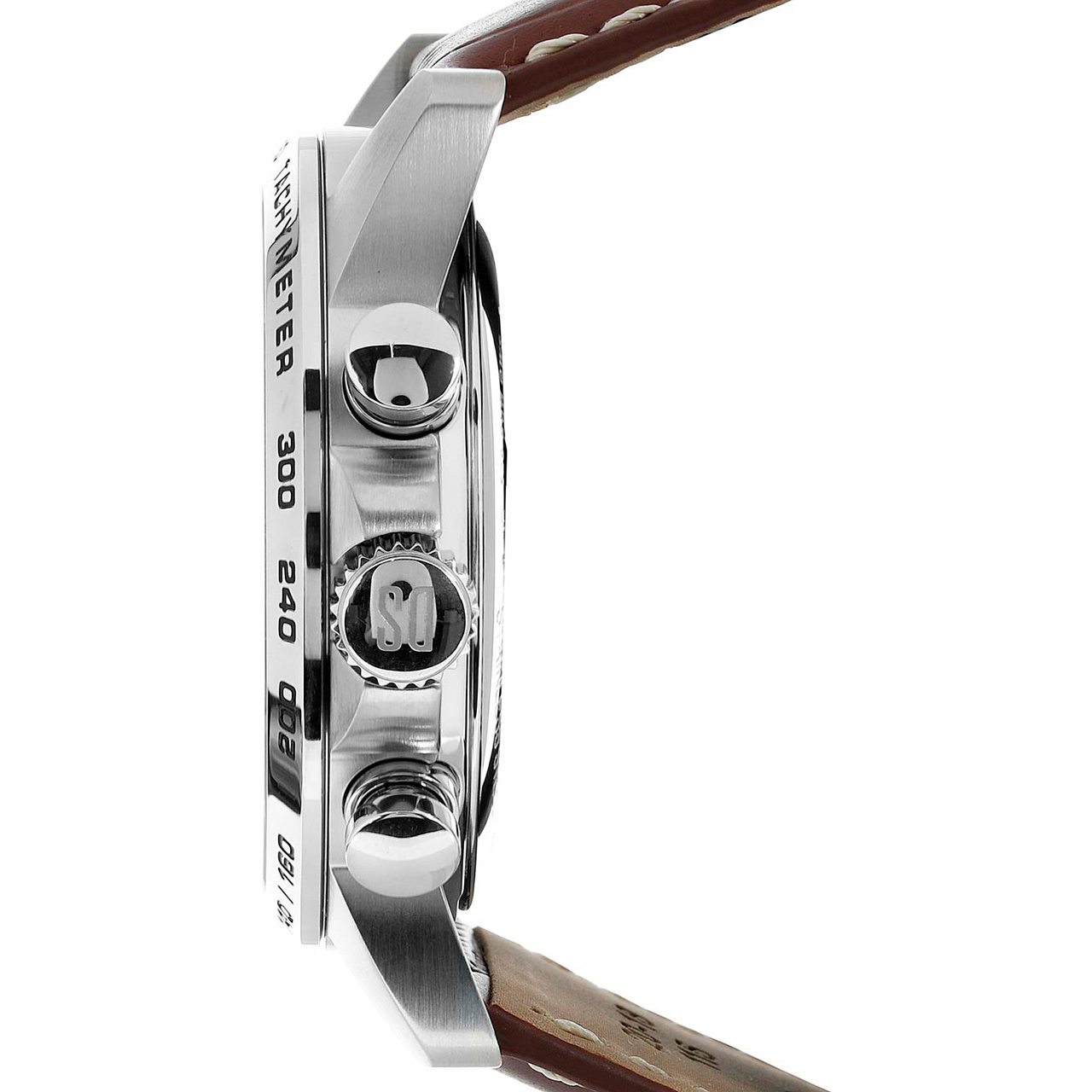 Функции: Центральные часовая и минутная стрелки, маленькая секундная стрелка на «6 часов». Апертура даты на «4 часа». Хронограф: центральная секундная стрелка, 30-минутный и 1/10-секундный индикаторы на «9» и «3 часах» соответственно. Тахиметр.