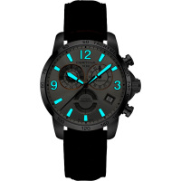 Функции: Индикация часов, минут центральными стрелками. Хронограф с 60-ти секундным, 30-ти минутным и 12-ти часовым счетчиками, индикация 2-го часового пояса на "10" часов, индикация даты и вынесенная секундная стрелка на "6" часов. Тахиметр.
