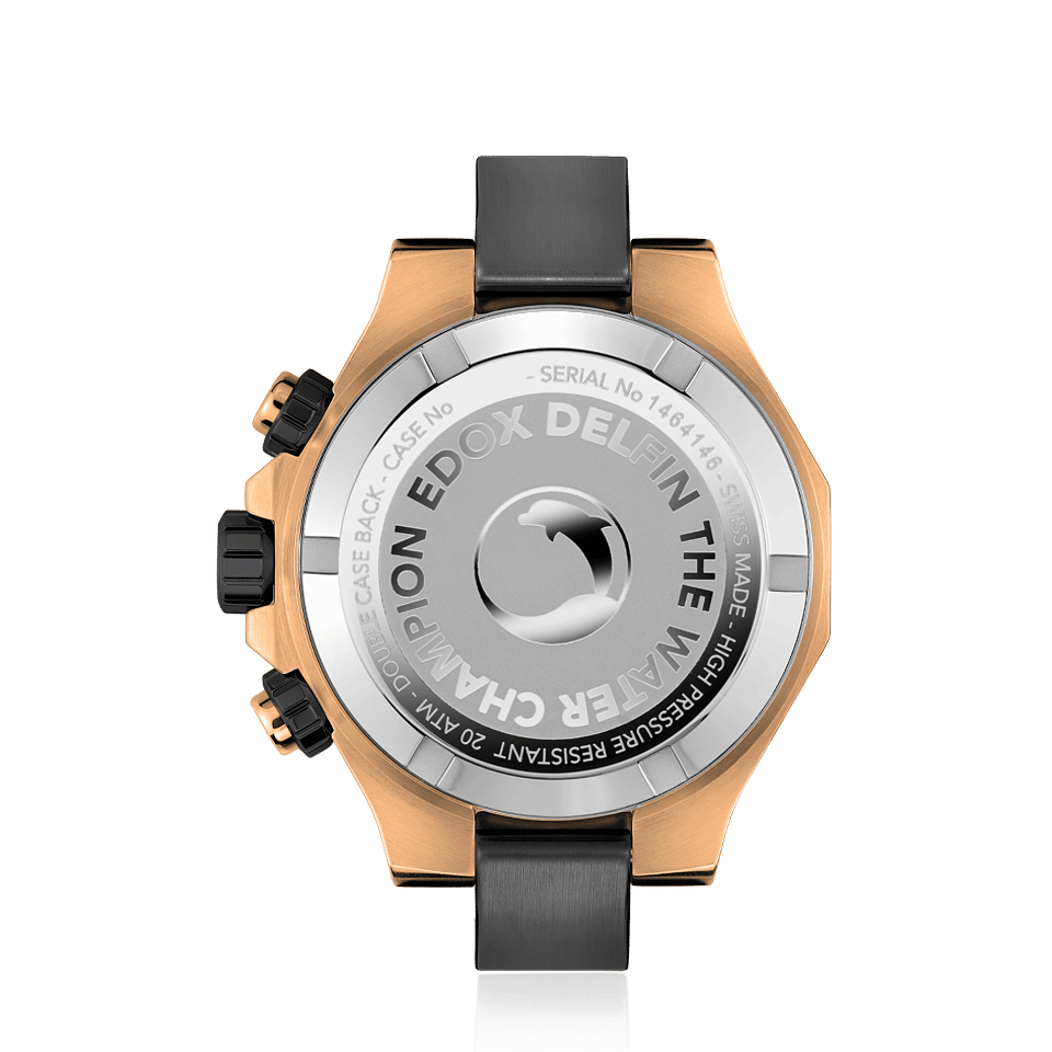 Корпус: Корпус выполнен из высококачественной стали с повышенной устойчивостью к коррозии цвета розового золота, с PVD-покрытием чёрного цвета по безелю. Чёрный циферблат. Стрелки и часовые индексы позолоченные, полированные с покрытием Super-LumiNova®. Сапфировое стекло с антибликовым покрытием. Заводная головка с защитой. Завинчивающаяся задняя крышка. Заводная головка и кнопки управления хронографом с двойной прокладкой для герметичности. Диаметр: 43 мм. Водонепроницаемость: 200 м.