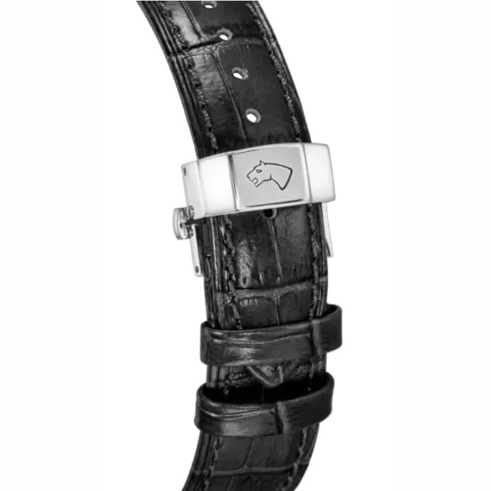 Ремешок: Кожаный ремень чёрного цвета обеспечивает комфортное ношение, застежка гарантирует надёжную фиксацию на запястье.