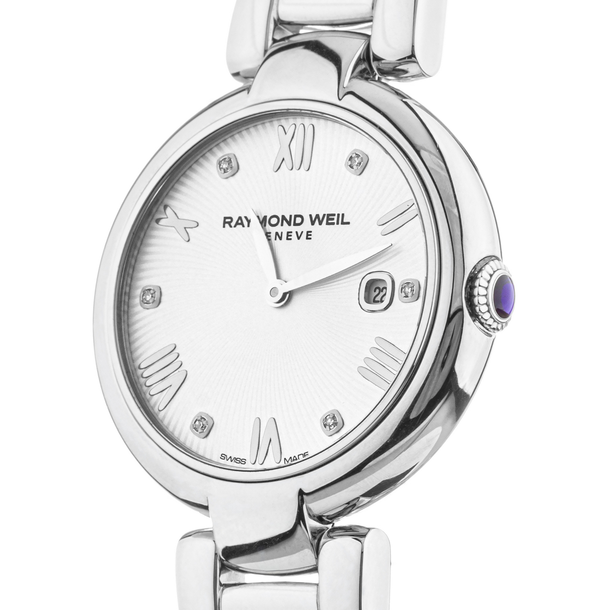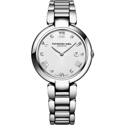 Корпус: Корпус из нержавеющей полированной стали. Серебристый циферблат с центральными листовидными стрелками часов и минут с жёлто-золотым PVD-покрытием, римскими цифрами (II, IIII, VI, VIII, X, XII) с жёлто-золотым PVD-покрытием, шестью бриллиантами огранки single cut 8/8 - SI2 à SI1 в виде условных часовых индексов. Общее количество бриллиантов – 6, общий вес бриллиантов – 0,02 карата. Диаметр 32 мм. Водостойкость 50 м.