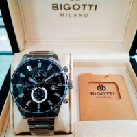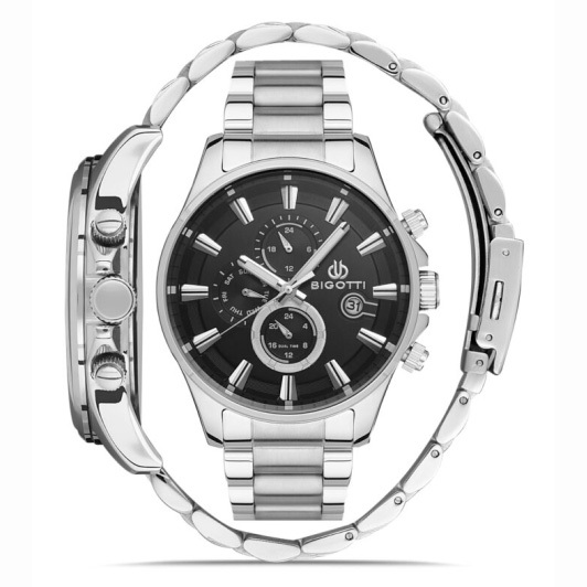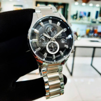 Функции: Индикация часов, минут и секунд при помощи центральных стрелок. Часы с отображением второго часового пояса, дня недели и текущего времени в 24-х часовом формате на малых циферблатах. Присутствует окошко даты.