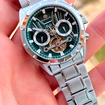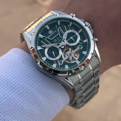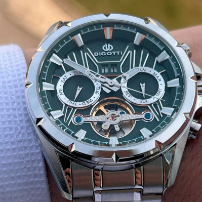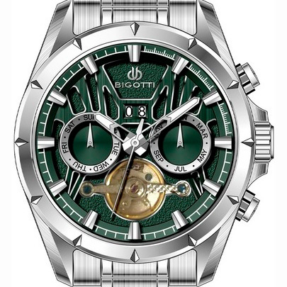 Корпус: Стильные мужские часы с частично скелетонизированным циферблатом. Корпус изготовлен из нержавеющей. Циферблат зелёного цвета. Часовые индексы и стрелки с люминесцентным покрытием. Прочное минеральное стекло обеспечит защиту часов от повреждений. Прочная задняя крышка. Завинчивающаяся заводная головка. Диаметр: 43 мм. Водонепроницаемость: 50 м.