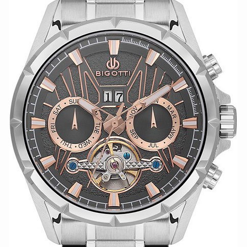 Корпус: Стильные мужские часы с частично скелетонизированным циферблатом. Корпус изготовлен из нержавеющей. Циферблат тёмно серого цвета. Часовые индексы и стрелки с люминесцентным покрытием. Прочное минеральное стекло обеспечит защиту часов от повреждений. Прочная задняя крышка. Завинчивающаяся заводная головка. Диаметр: 43 мм. Водонепроницаемость: 50 м.