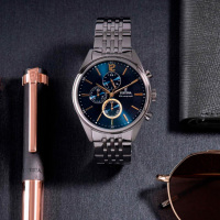 Корпус: Ударопрочный корпус часов сделан из нержавеющей стали. Синий циферблат с золотистыми стрелками и часовыми индексами в виде штрихов и нанесенным люминесцентным покрытием, которое светится в темноте после непродолжительной зарядки на свету. Минеральное стекло устойчивое к возникновению царапин. Рифленая заводная головка. Диаметр 42 мм. Водонепроницаемость 50 м.