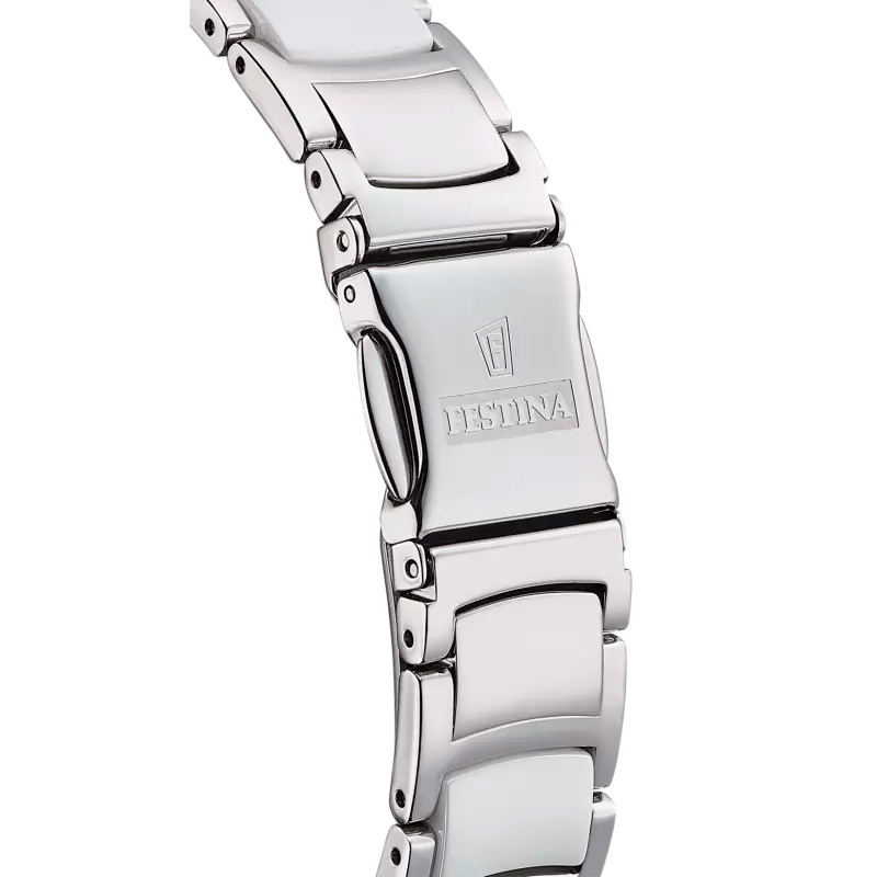 Ремешок: Надежный, прочный браслет из нержавеющей стали, вставки из керамики белого цвета. Застёжка с системой блокировки, украшена фирменным логотипом Festina.