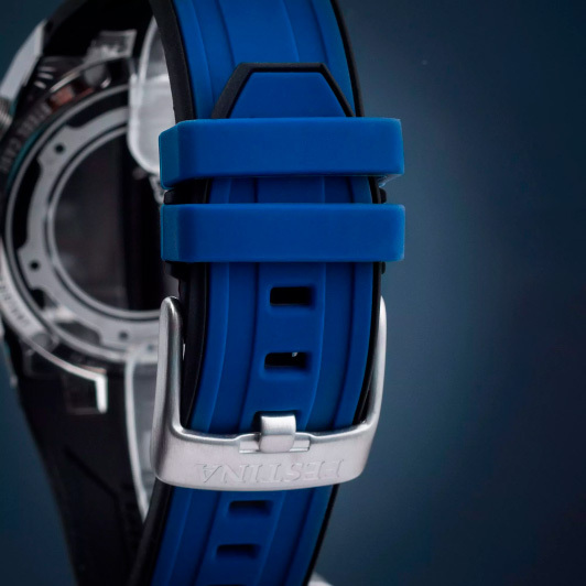 Ремешок: Силиконовый ремешок синего цвета с классической застежкой.