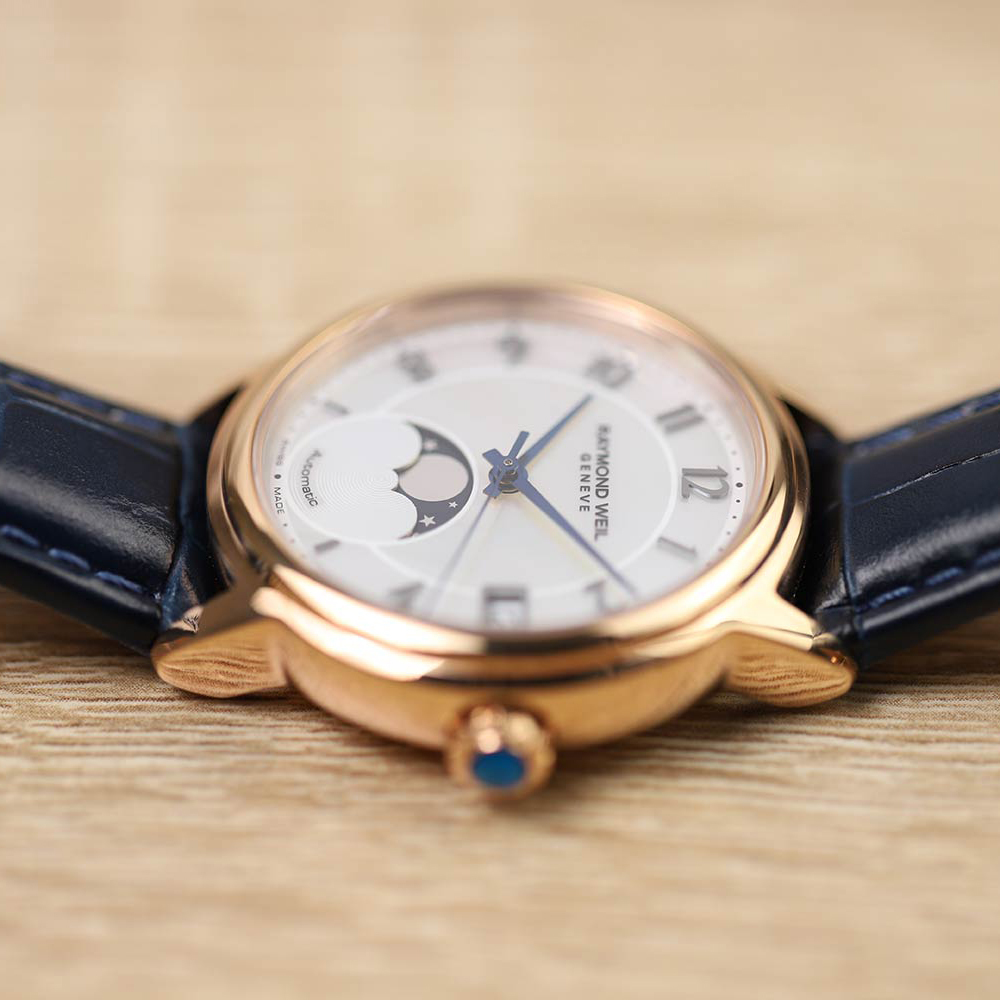 Функции: Центральные часовая, минутная и секундная стрелки, индикация даты. Фигурная апертура в нижней части циферблата открывает указатель фазы Луны.