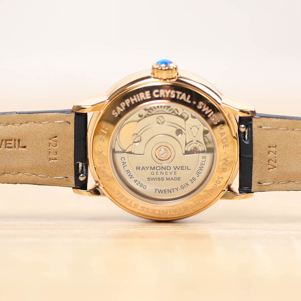 Корпус: Корпус круглой формы выполнен из нержавеющей стали марки 316L с PVD-покрытием цвета розового золота. Циферблат из натурального перламутра, метки в виде арабских цифр. Сапфировое стекло имеет повышенную устойчивость к возникновению царапин. Прозрачная задняя крышка с сапфировым стеклом. Рифленая заводная головка украшена синим лаком. Диаметр корпуса 34 мм, толщина 9,4 мм. Водостойкость на глубине до 50 метров.