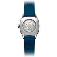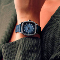 Корпус: Квадратный корпус в форме «подушки» изготовлен из полированной нержавеющей стали и украшен 60 искусственными бриллиантами 0,399К. Циферблат c синим градиентом и гильоше в центре, мотивом которого послужила фирменная буква «W». Накладные метки в виде штрихов и стрелки с люминесцентным покрытием SuperLuminova, которое светится в темноте после непродолжительной зарядки на свету. Устойчивое к возникновению царапин сапфировое стекло с антибликовым покрытием с двух сторон. Прозрачная задняя крышка с сапфировым стеклом. Заводная головка украшена монограммой RW. Размер корпуса 34,5х34,5мм, толщина 9,3мм. Водозащита 100 метров.