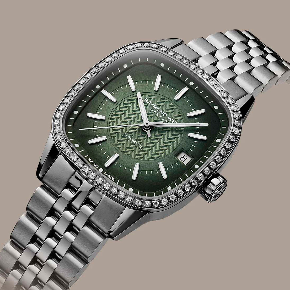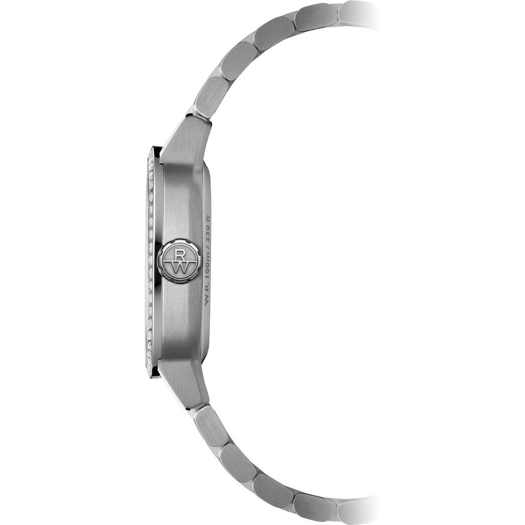 Корпус: Квадратный корпус в форме «подушки» изготовлен из полированной нержавеющей стали и украшен 60 искусственными бриллиантами 0,399К. Циферблат c зелёным градиентом и гильоше в центре, мотивом которого послужила фирменная буква «W». Накладные метки в виде штрихов и стрелки с люминесцентным покрытием SuperLuminova, которое светится в темноте после непродолжительной зарядки на свету. Устойчивое к возникновению царапин сапфировое стекло с антибликовым покрытием с двух сторон. Прозрачная задняя крышка с сапфировым стеклом. Заводная головка украшена монограммой RW. Размер корпуса 34,5х34,5мм, толщина 9,3мм. Водозащита 100 метров.