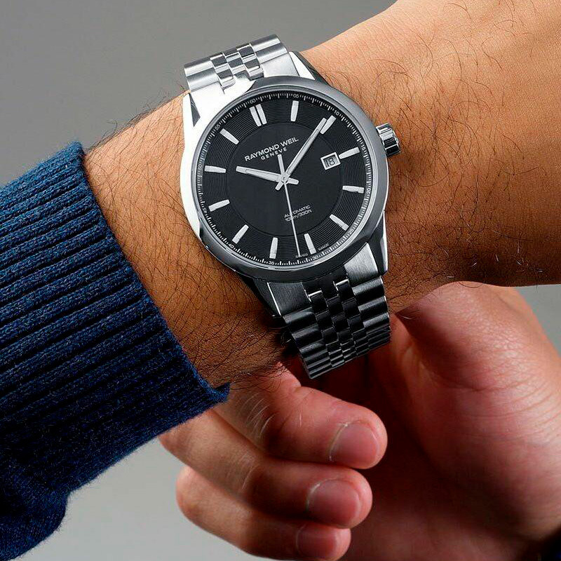 Ремешок: Модель на браслете из высококачественной стали с 5 рядами литых звеньев. Браслетная застежка, раскладывающаяся при нажатии на кнопки с двойной системой блокировки, украшена гравировкой Raymond Weil.