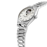 Корпус: Корпус выполнен из высокосортной нержавеющей стали, марки 316L с полировкой и матовой шлифовкой (сатинированием) поверхностей. Циферблат имеет белый цвет с матовой шлифовкой, гильоширование со стилизованным изображением Земного шара. Аппликация часовых индексов и стрелки с родиевым покрытием. Люминесцентный состав светящийся в темноте. Инкрустация 8 бриллиантов весом 0,04 карата в качестве часовых меток. Сапфировое стекло с повышенной устойчивостью к появлению царапин имеет антибликовое покрытие с обеих сторон. Заводная коронка украшена миниатюрой эмблемой марки. Задняя крышка с прозрачным окном соединяется с корпусом 4 винтами. Диаметр корпуса составляет - 34 мм, толщина - 9,67 мм. Водостойкость: 5 АТМ.