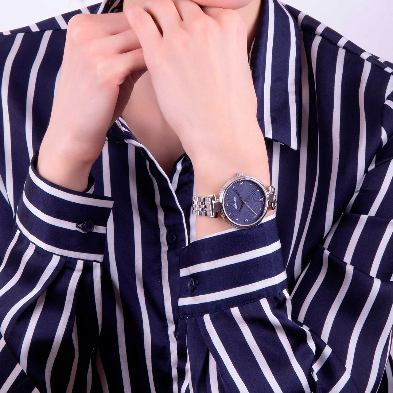Корпус: Круглый корпус выполнен из полированной нержавеющей стали. Синий циферблат с узором гильоше, украшен 4 кристаллами. Накладные часовые индексы выполнены из стали. Стрелки с покрытием SuperLuminova, которое обеспечивает подсветку в темное время суток. Минеральное стекло. Диаметр корпуса составляет 35 мм, толщина 8 мм. Водостойкость WR 30 (мытье рук, дождь).