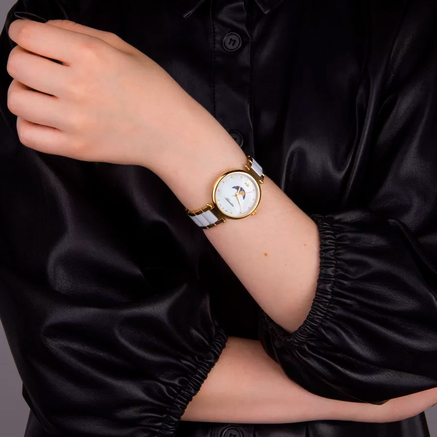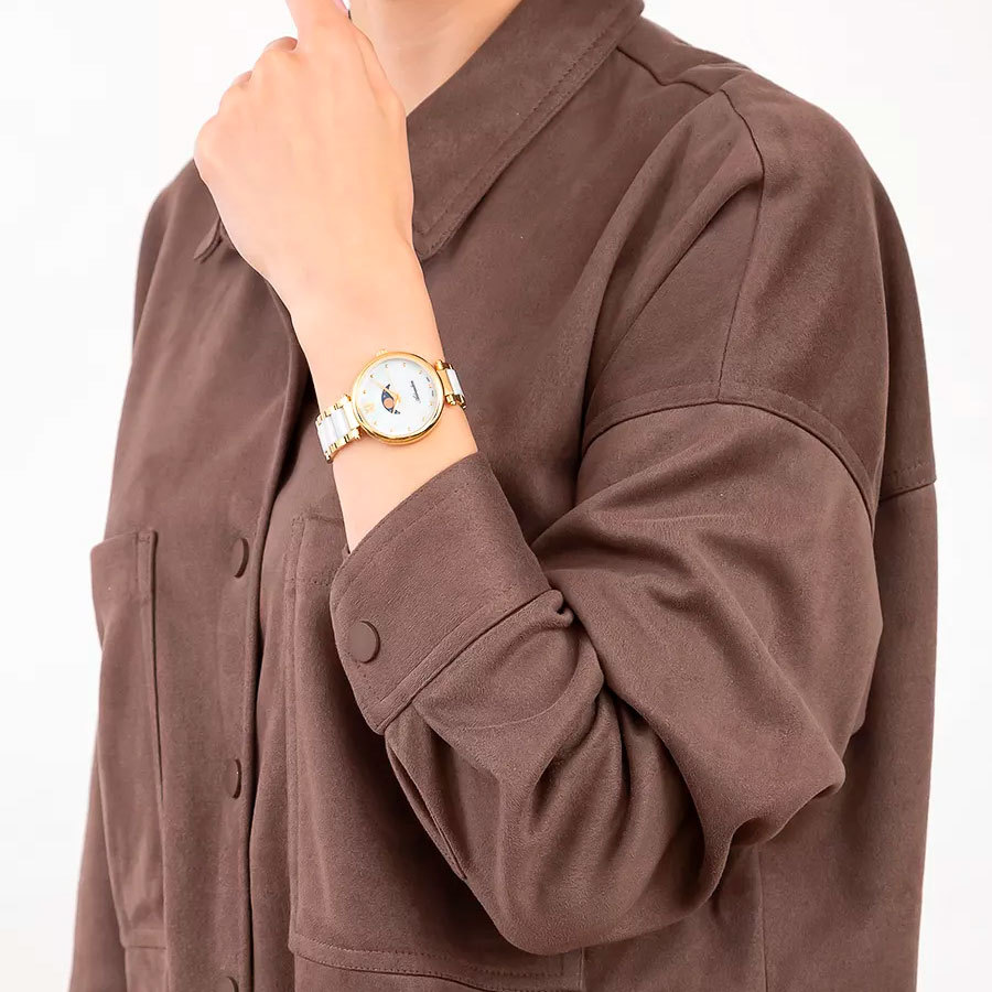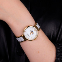 Корпус: Круглый корпус выполнен из полированной нержавеющей стали с жёлтым PVD покрытием. Белый перламутровый циферблат. Накладные часовые метки и стрелки выполнены из стали с золотым покрытием. Минеральное стекло. Диаметр корпуса составляет 34 мм, толщина 7 мм. Водостойкость WR 50 (мытье рук, дождь).