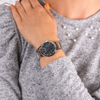 Корпус: Круглый корпус выполнен из полированной нержавеющей. Чёрный перламутровый циферблат и украшен 12 кристаллами. Накладные часовые метки и стрелки выполнены из стали. Минеральное стекло. Диаметр корпуса составляет 34 мм, толщина 7 мм. Водостойкость WR 30 (мытье рук, дождь).