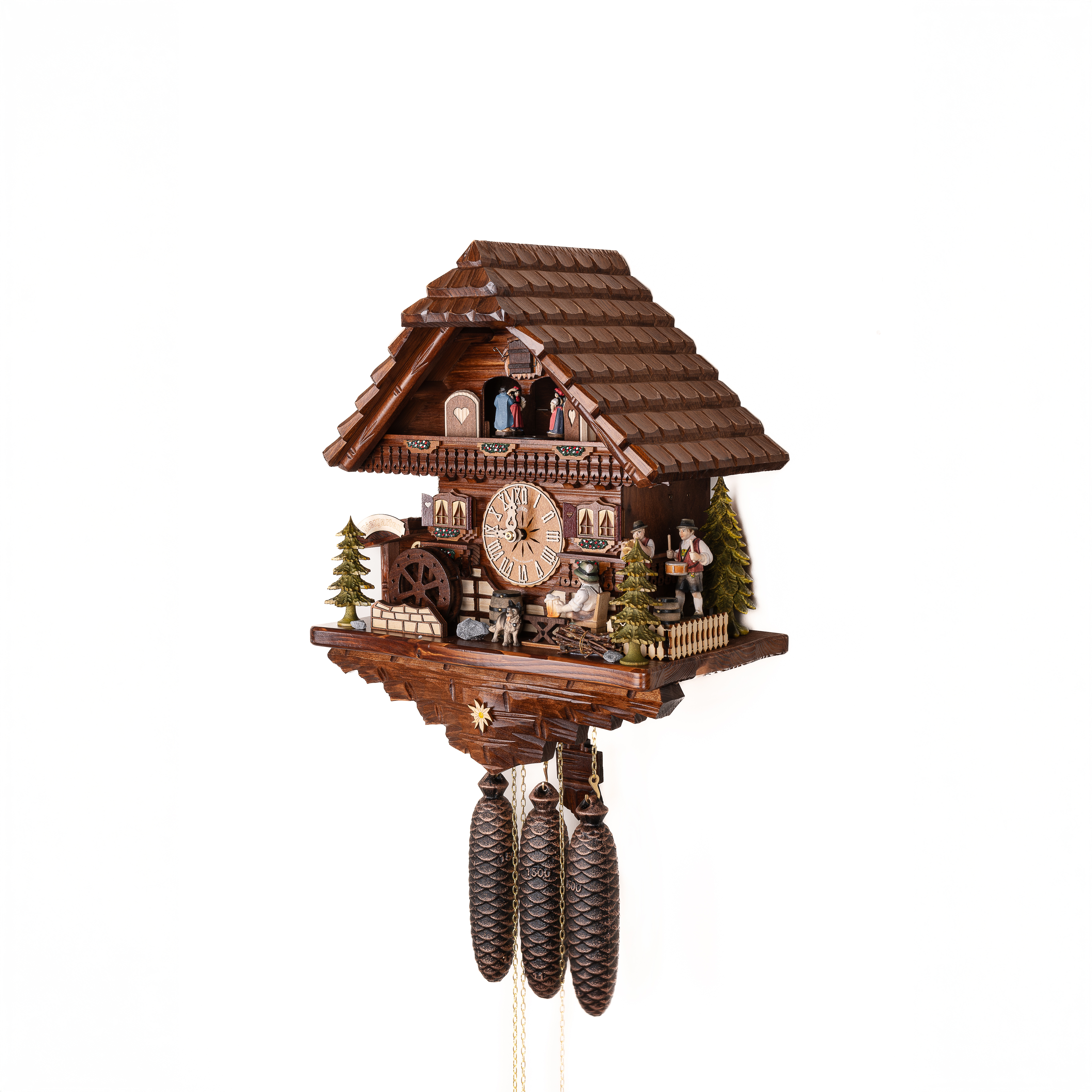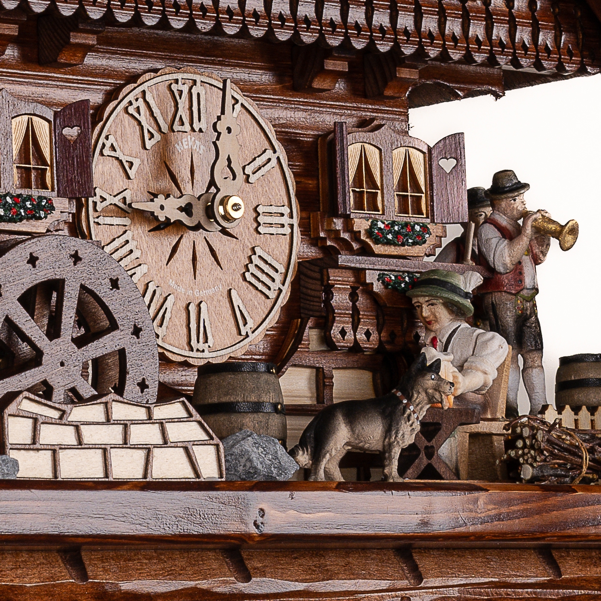 Механизм: Механические часы с кукушкой, которые работают от гирь на цепной тяге. Сделан механизм на фирме SBS-Feintechnik GmbH & Co. KG Германия. Шварцвальдский дом с подвижным человеком, пьющим пиво, крутящимся мельничным колесом и танцующими парами на балконе. Запас хода на 8 дней. Ручное отключение звука. В каждые пол часа кукушка появляется из своего домика, наклоняется и воспроизводит звук кукушки (ку-ку) один раз, в каждый полный час она кукует столько раз сколько показывают стрелки на часах. После этого на балкончике начинают кружиться в танце деревянные фигурки под музыку (2 мелодии чередуются). Одна гиря в данных часах отвечает за ход часового механизма, вторая за механизм кукушки, а третья за воспроизведение музыки, как в музыкальной шкатулке, и за движение декоративных фигурок, водяной мельницы, танцующих пар на балконе.