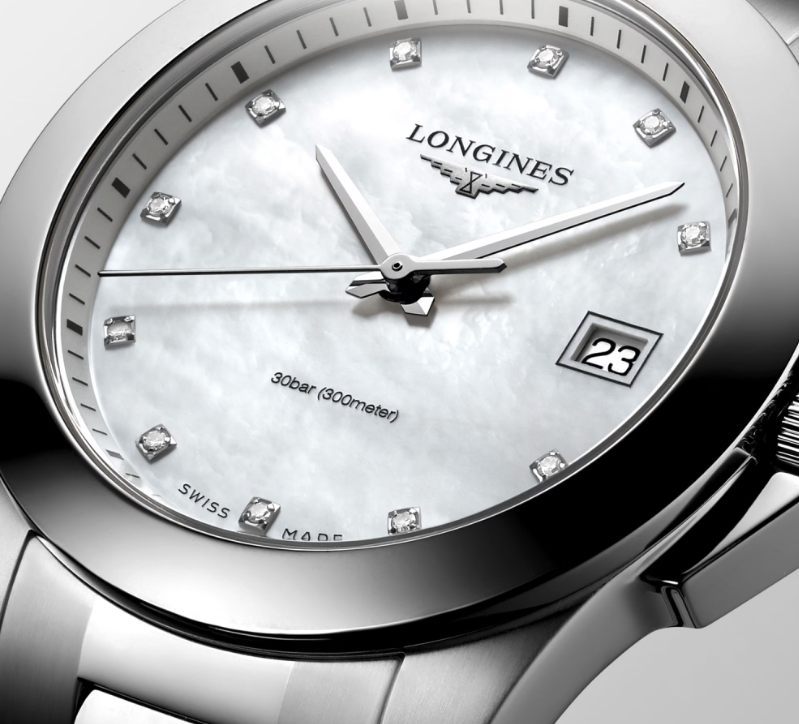 Корпус: Нержавеющая сталь. Циферблат белый перламутровый, 11 бриллиантов. Сапфировое стекло с антибликовым покрытием. Водонепроницаемость 300 метров. Размер 34 мм.