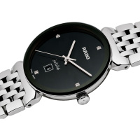Корпус: Нержавеющая сталь 316L. Матовый чёрный циферблат украшен четырьмя бриллиантами полной огранки. Заострённые прямоугольные стрелки с родиевым покрытием в стиле Baton. Инновационное металлизированное сапфировое стекло. Рифленая заводная головка. Диаметр 30 мм. Водостойкость 50 м.