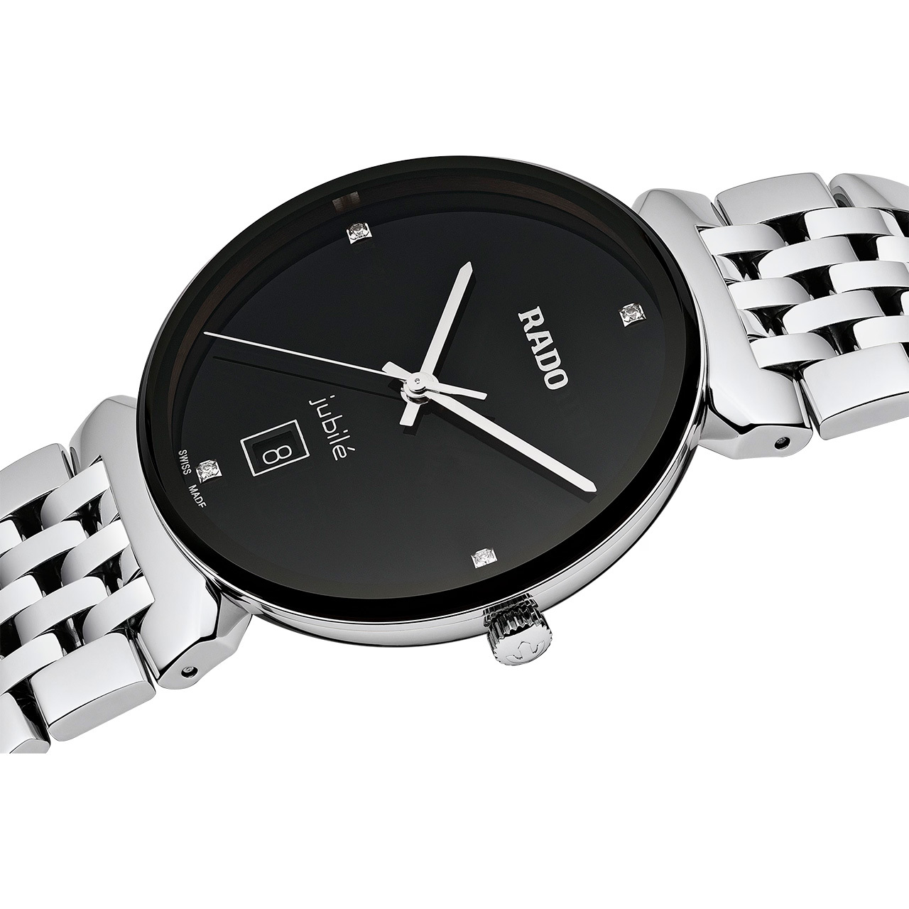 Корпус: Нержавеющая сталь 316L. Матовый чёрный циферблат украшен четырьмя бриллиантами полной огранки. Заострённые прямоугольные стрелки с родиевым покрытием в стиле Baton. Инновационное металлизированное сапфировое стекло. Рифленая заводная головка. Диаметр 38 мм. Водостойкость 50 м.
