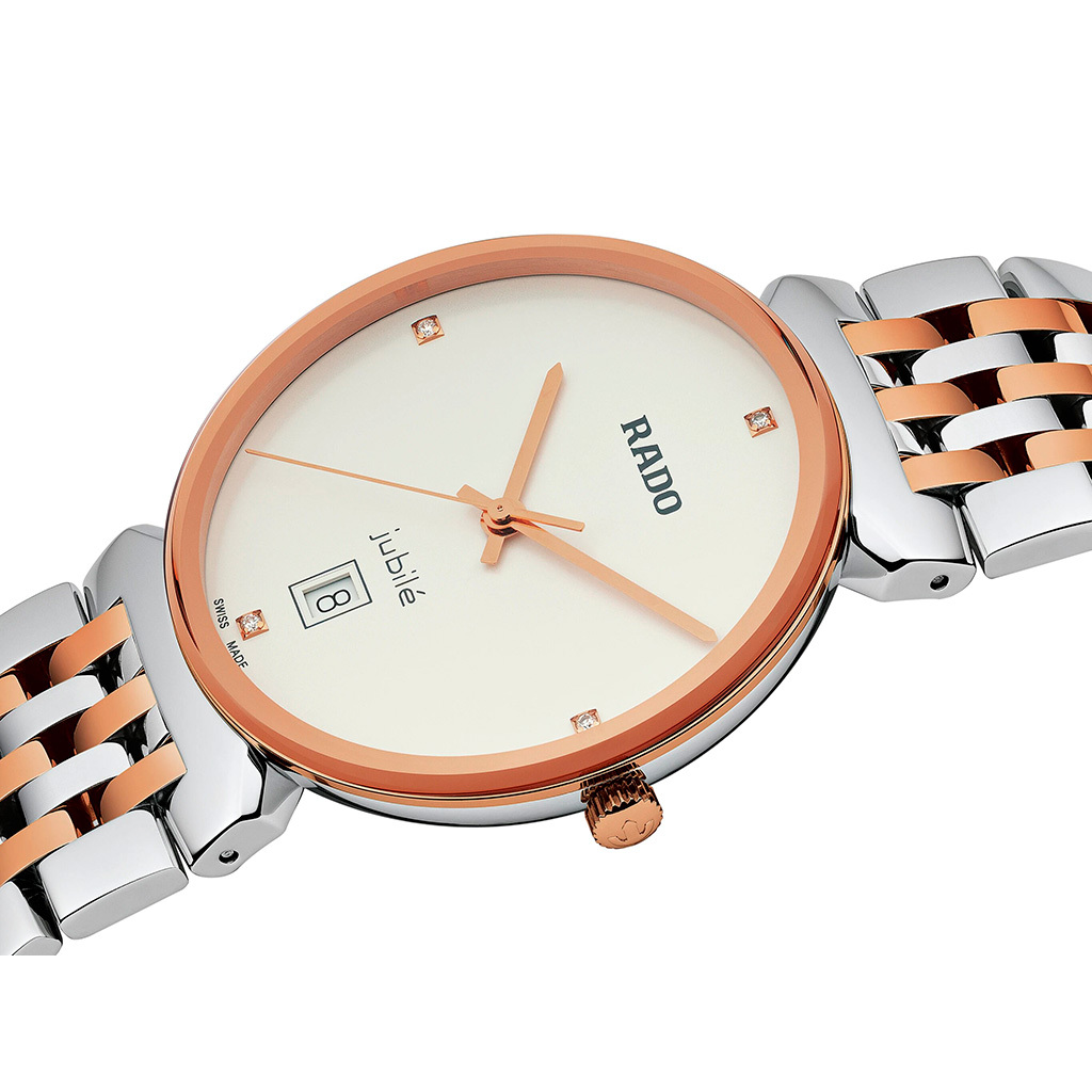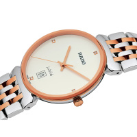 Корпус: Нержавеющая сталь с частичным PVD-покрытием розового золота. Металлик циферблат с золотистыми стрелками декорирован 4 бриллиантами. Сапфировое стекло. Диаметр 38 мм. Водонепроницаемость 30 метров.