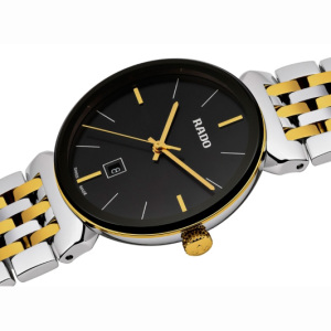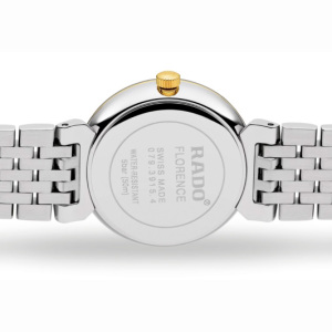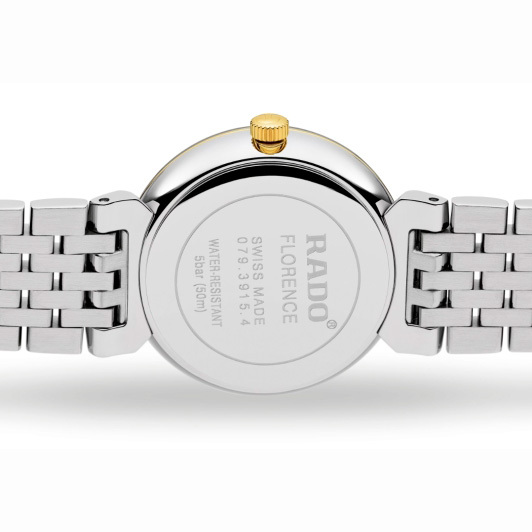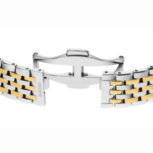 Корпус: Корпус из нержавеющей стали 316L с повышенной устойчивостью к коррозии, с частичным PVD-покрытием цвета жёлтого золота, поверхности с матовой шлифовкой – сатинированием и полировкой до зеркального блеска. Циферблат чёрного цвета. Часовые индексы и стрелки отполированы до алмазного блеска с позолотой. Фирменное сапфировое стекло Rado с металлическим покрытием. Диаметр корпуса составляет: 30 мм. Водостойкость: 50 м.