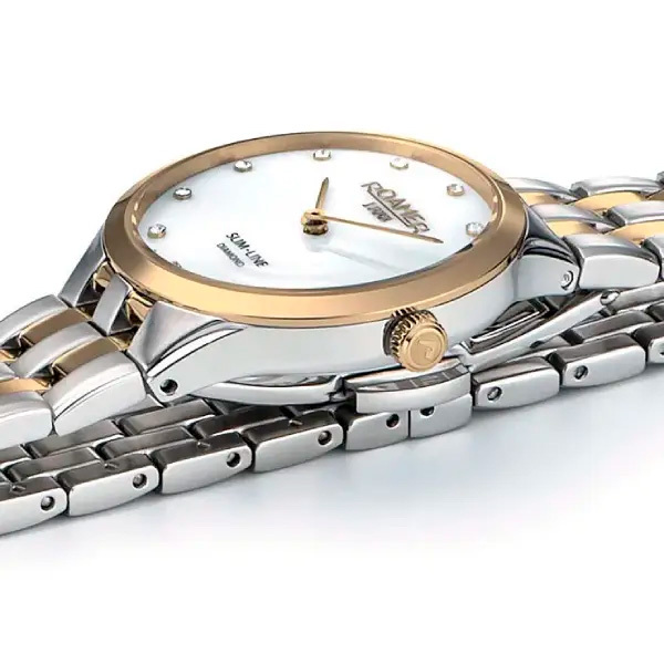 Корпус: Корпус выполнен из высококачественной нержавеющей стали 316L с частичным покрытием желтого цвета. Перламутровый циферблат, позолоченные стрелки и часовые индексы, бриллианты изысканной огранки. Сапфировое стекло с антибликовым покрытием. Диаметр: 30 мм. Водозащита: 50 м.