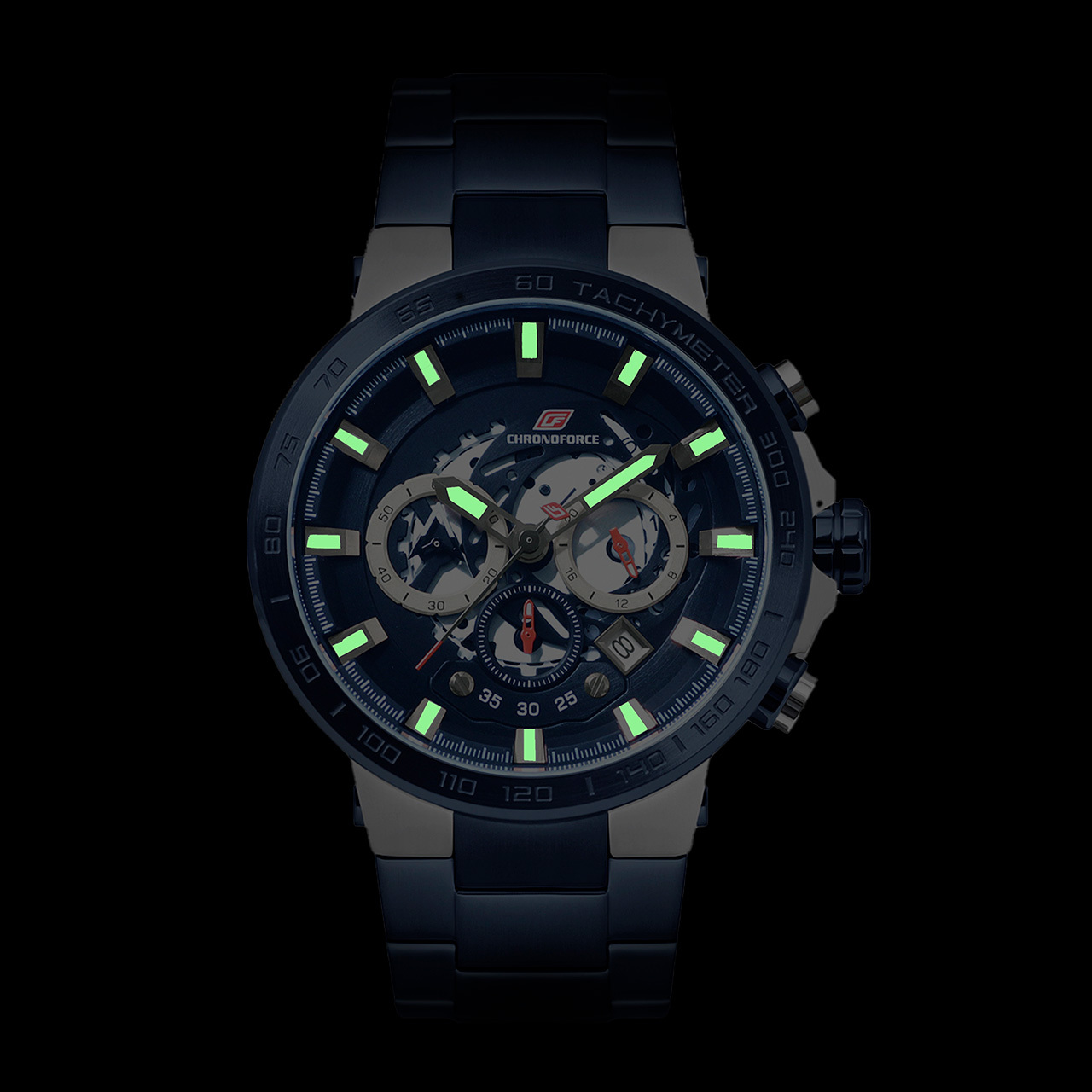 Ремешок: Браслет выполнен из нержавеющей стали с IP(ионное) покрытием. Браслетная раскладывающаяся застежка с гравировкой логотипа. Каждые часы бренда Chronoforce имеют уникальную упаковку, в виде мотоциклетного шлема.