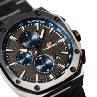 Корпус: Корпус выполнен из нержавеющей стали AISI 304, придающей часам особую прочность и стойкость от повреждений с IP покрытием серого цвета. Часовые индексы и стрелки с покрытием SuperLuminova, которое обеспечивает подсветку в темное время суток. Циферблат серого/синего цвета многослойный, словно 3D, основа покрыта металлизированной пудрой, для придания эффекта шершавости. Упрочненное минеральное стекло Hardlex(разработанное компанией Seiko Watch Corporation, которое обладает высокой устойчивостью к ударам и царапинам, около 7 баллов по шкале Мооса). Размер корпуса: 44 мм. Водонепроницаемость: 100 м.