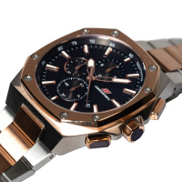 Корпус: Корпус выполнен из нержавеющей стали AISI 304, придающей часам особую прочность и стойкость от повреждений. Безель, кнопки хронографа и заводная головка с IP покрытием розового золота. Часовые индексы и стрелки с покрытием SuperLuminova, которое обеспечивает подсветку в темное время суток. Циферблат чёрного цвета многослойный, словно 3D, основа покрыта металлизированной пудрой, для придания эффекта шершавости. Упрочненное минеральное стекло Hardlex(разработанное компанией Seiko Watch Corporation, которое обладает высокой устойчивостью к ударам и царапинам, около 7 баллов по шкале Мооса). Размер корпуса: 44 мм. Водонепроницаемость: 100 м.