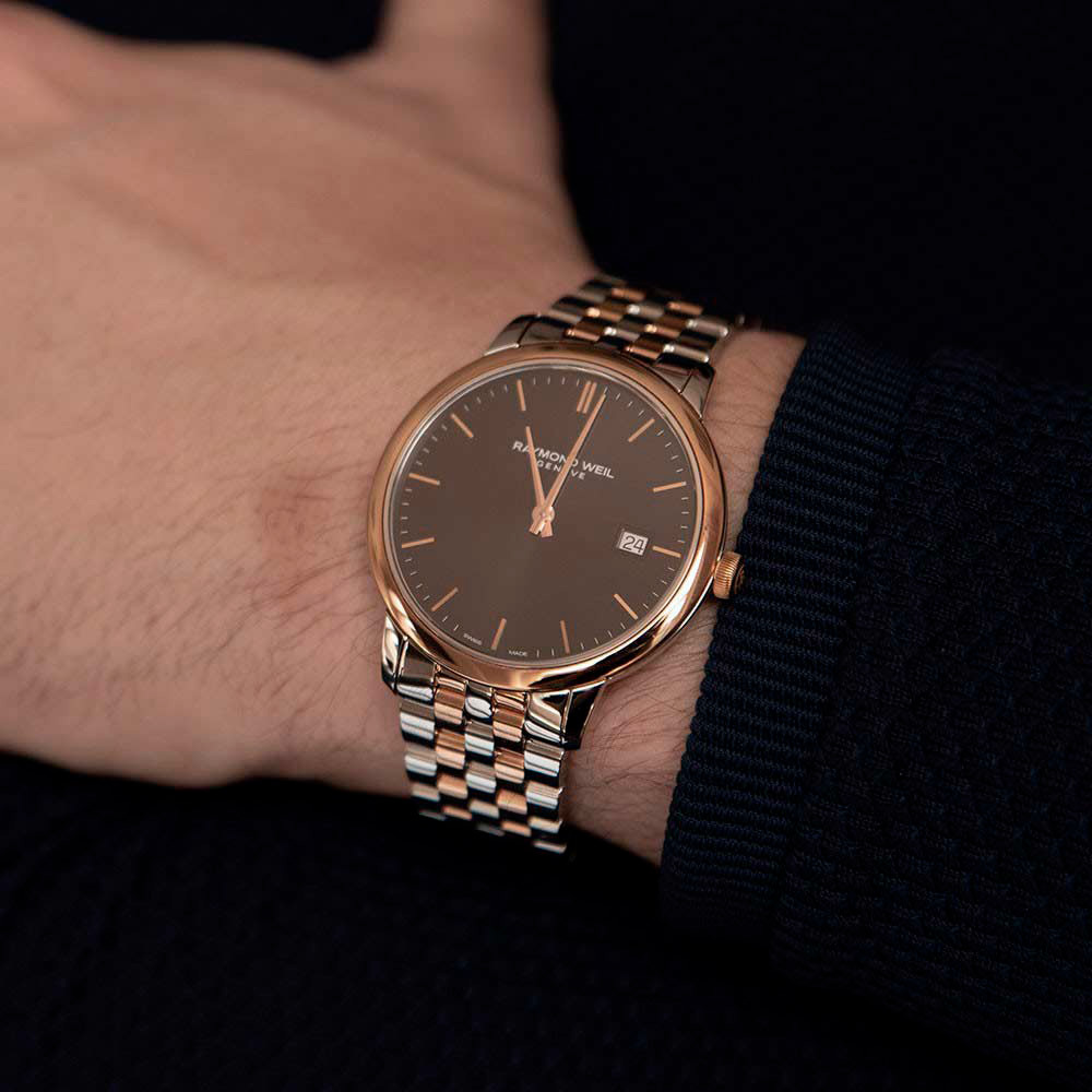 Ремешок: Модель на браслете с 5 рядами литых звеньев из высококачественной стали с частичным PVD - покрытием. Браслетная застежка, раскладывающаяся при нажатии на кнопки с двойной системой блокировки, украшена гравировкой Raymond Weil.