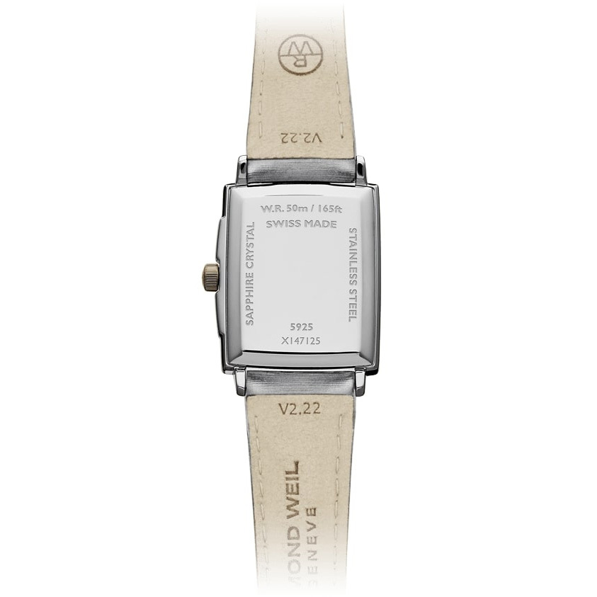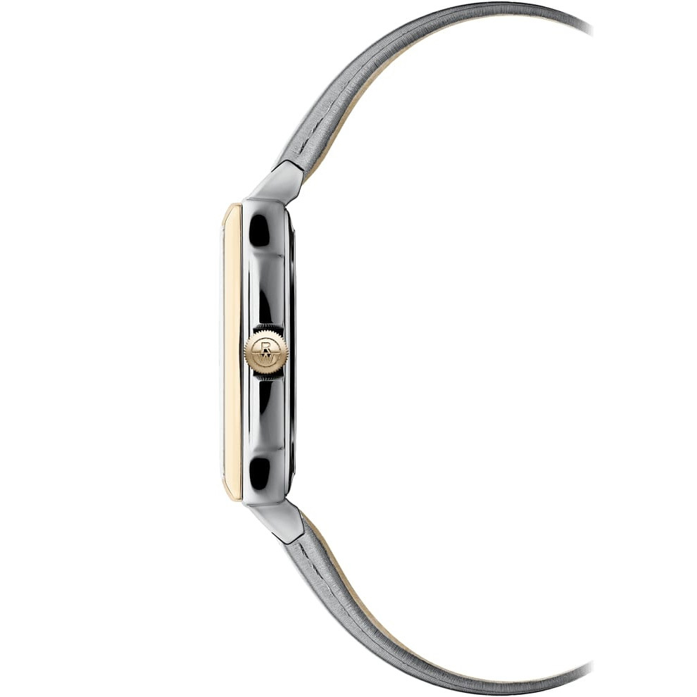 Корпус: Корпус прямоугольной формы выполнен из нержавеющей стали марки 316L, безель и переводная коронка с PVD покрытием цвета розового золота. Циферблат из натурального перламутра, аппликация римских цифр и граненые стрелки имеют покрытие желтым золотом, циферблат украшен инкрустацией 8 бриллиантов 8/8 SI2 - SI1, весом 0,026 карата, в качестве часовых индексов. Сапфировое стекло имеет повышенную устойчивость к возникновению царапин. Переводная коронка украшена логотипом RW. Задняя крышка крепится к корпусу при помощи пресса. Размеры 22,6 на 28,1 мм, толшина - 6,4 мм. Водостойкость 50 метров (165 ft / 5 АТМ).