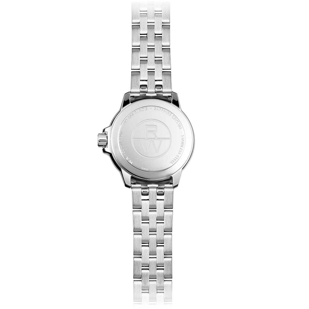 Ремешок: Браслет с литыми звеньями в пять рядов, выполненными из нержавеющей стали. Браслетная застежка, раскладывающаяся при нажатии на кнопки с двойной системой безопасности и гравировкой Raymond Weil.