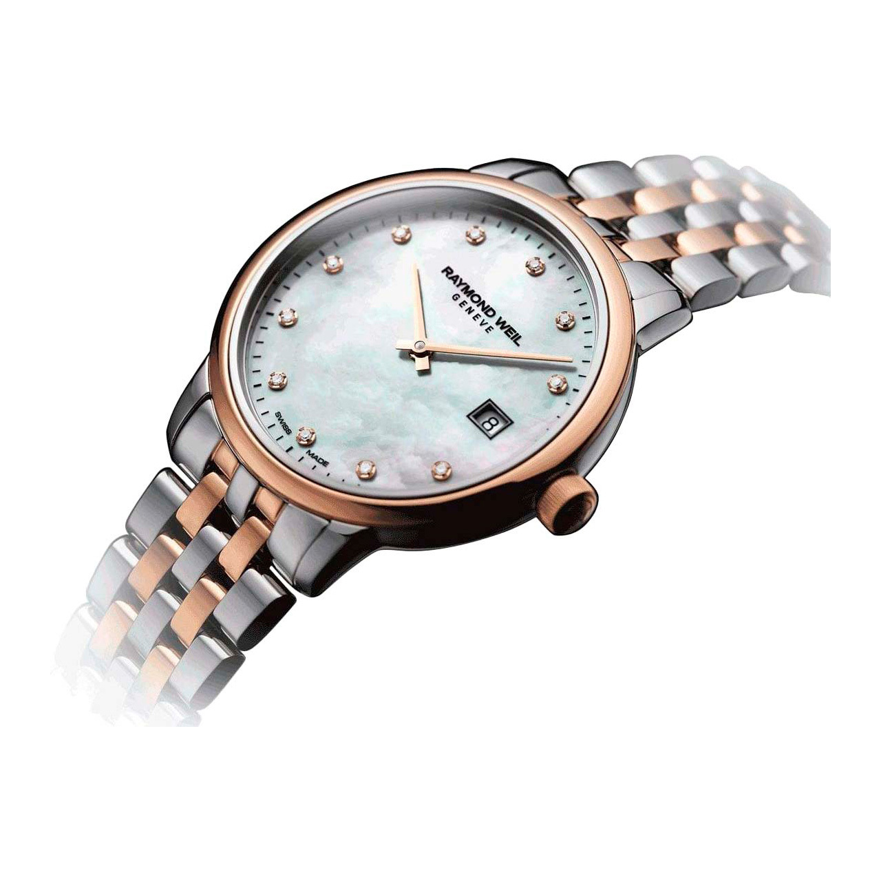Ремешок: Модель на браслете с 5 рядами литых звеньев из высококачественной стали с частичным PVD - покрытием. Браслетная застежка, раскладывающаяся при нажатии на кнопки с двойной системой блокировки, украшена гравировкой Raymond Weil.