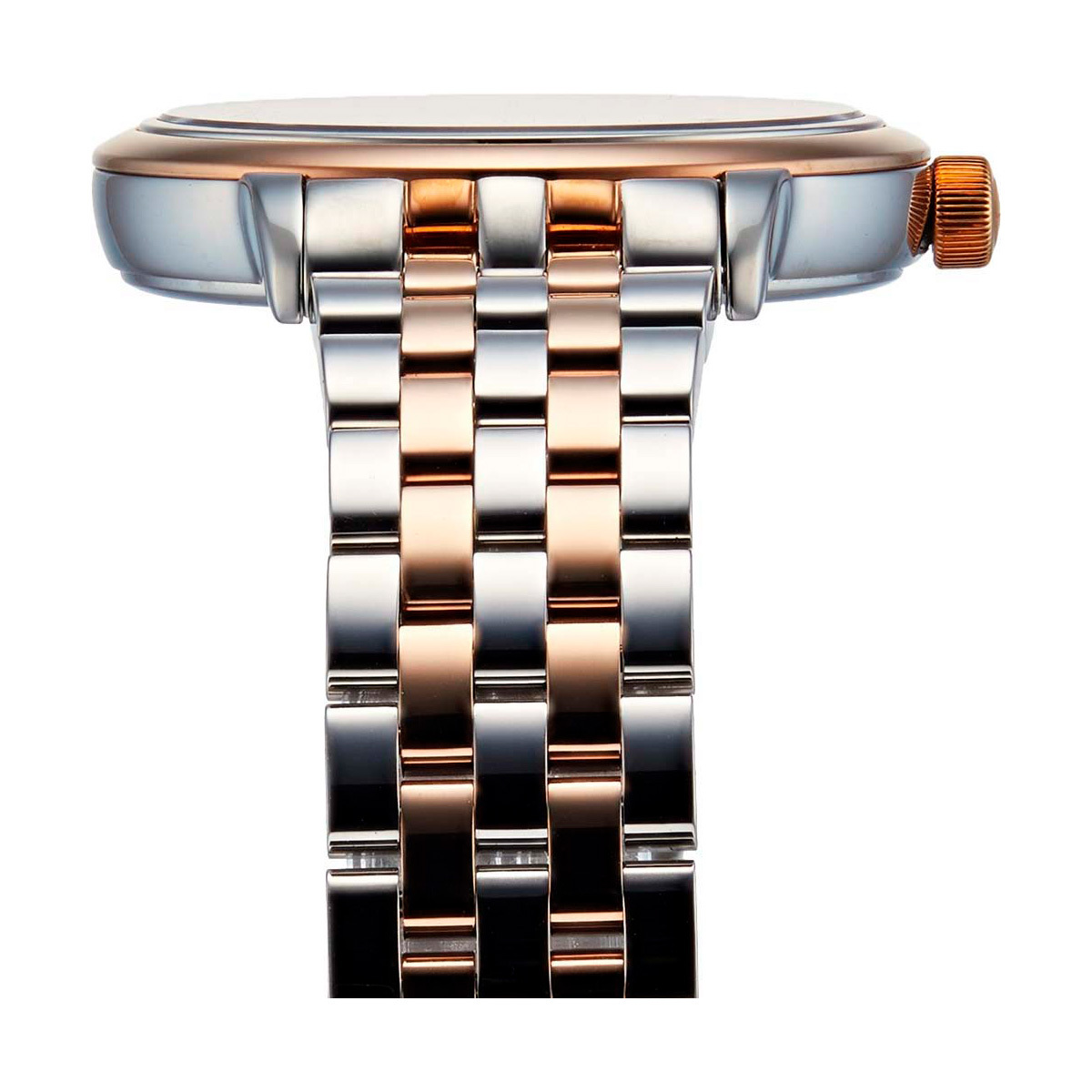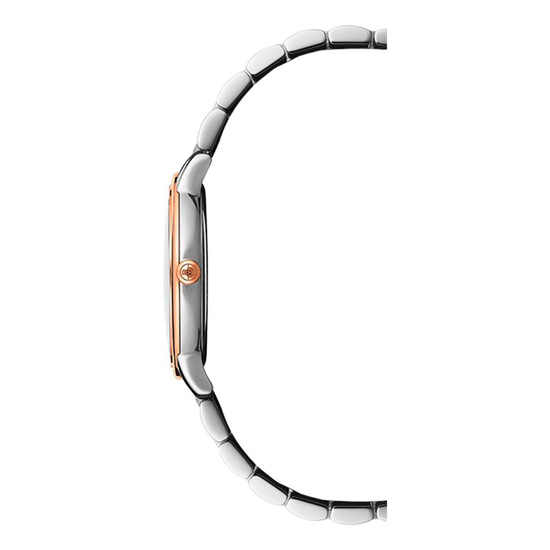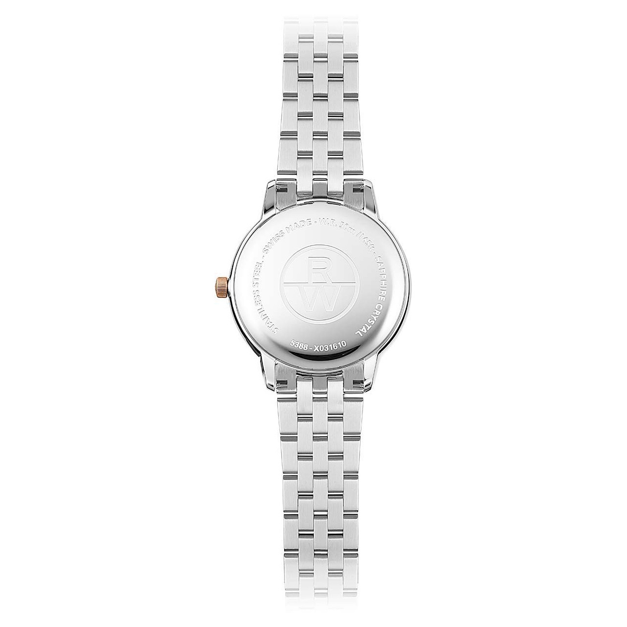 Корпус: Корпус из нержавеющей стали марки 316L. Безель и переводная коронка с PVD покрытием цвета розового золота. Диаметр 29 мм, толщина 6,7 мм. Переводная коронка украшена логотипом RW. Сапфировое стекло. Циферблат из натурального перламутра инкрустирован 11 бриллиантами, общим весом 0,04 карата, граненые стрелки имеют покрытие цвета золота. Водостойкость 50 метров.