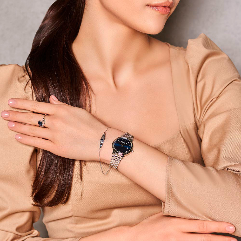 Корпус: Корпус из нержавеющей стали марки 316L. Переводная коронка украшена логотипом RW. Сапфировое стекло. Циферблат глубокого синего цвета с шлифовкой "солнечные лучи", инкрустирован 11 бриллиантами, общим весом 0,04 карата, граненые стрелки имеют покрытие цвета золота. Диаметр 29 мм, толщина 6,7 мм. Водостойкость 50 метров.