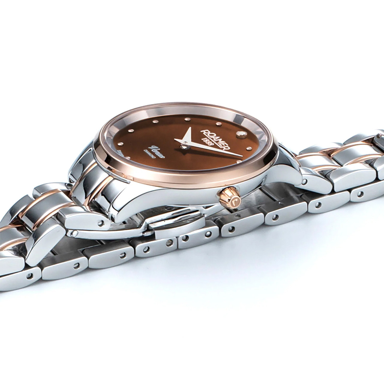 Корпус: Корпус выполнен из высококачественной нержавеющей стали 316L с частичным покрытием розового золота. Перламутровый циферблат коричневого цвета, позолоченные стрелки и часовые индексы, бриллиант изысканной огранки в положении "12 часов". Сапфировое стекло с антибликовым покрытием. Диаметр: 30 мм. Водозащита: 50 м.