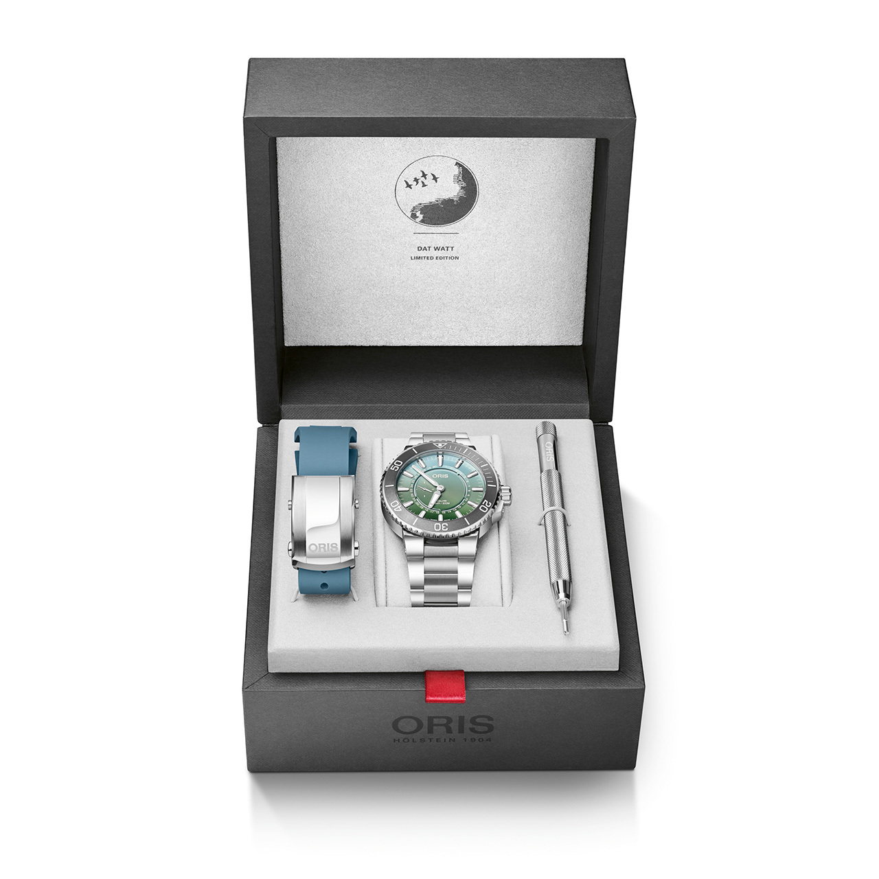 Ремешок: Браслет из нержавеющей стали с запатентованной компанией Oris раскладывающейся застёжкой. Поставляется в комплекте со сменным каучуковым ремешком.