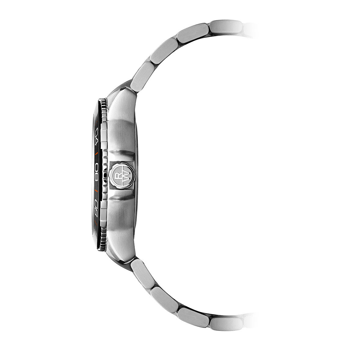 Корпус: Корпус круглой формы выполнен из нержавеющей стали марки 316L. Циферблат черного цвета с гильошированием по внешнему краю в виде концентрических полос. Часовые индексы, выполненные методом аппликации, и стрелки с серебристым покрытием, секундная стрелка и стрелка GMT имеют окраску оранжевого цвета. Люминесцентное покрытие Super-Luminova на стрелках, часовых индексах и маркере безеля. Сапфировое стекло с двухсторонним антибликовым покрытием имеет повышенную устойчивость к возникновению царапин. Переводная коронка с винтовой фиксацией украшена логотипом RW. Задняя крышка имеет резьбовое крепление к корпусу. Диаметр: составляет 42 мм, толщина - 11 мм. Водостойкость 300 метров (1000 ft / 30 АТМ).