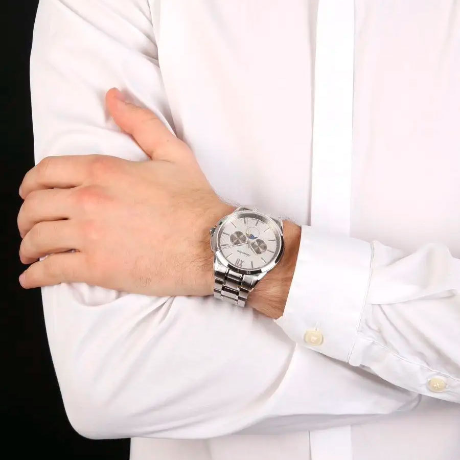 Корпус: Корпус выполнен из высококачественной стали с повышенной устойчивостью к коррозии, поверхности с матовой шлифовкой – сатинированием и полировкой до зеркального блеска. Серебристый циферблат с узором гильоше. Накладные часовые индексы и стрелки выполненый из стали. Стрелки с покрытием SuperLuminova, которое обеспечивает подсветку в темное время суток. Сапфировое стекло устойчивое к возникновению царапин. Диаметр корпуса составляет 45 мм, толщина 10 мм. Водостойкость WR 50 (мытье рук, дождь).
