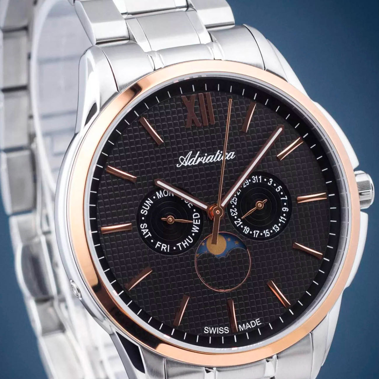 Функции: Центральные часовая, минутная и секундная стрелки. Индикатор фазы Луны. День недели и число отображаются на отдельных циферблатах.