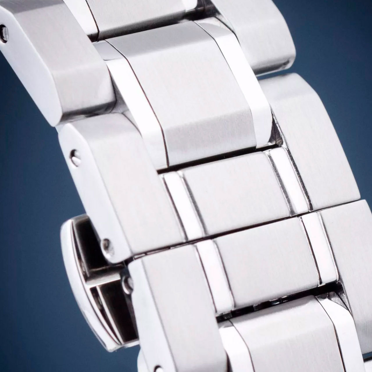 Ремешок: Браслет выполнен из высококачественной стали с повышенной устойчивостью к коррозии, поверхности с матовой шлифовкой – сатинированием и полировкой до зеркального блеска с раскладывающейся застежкой на фиксации.