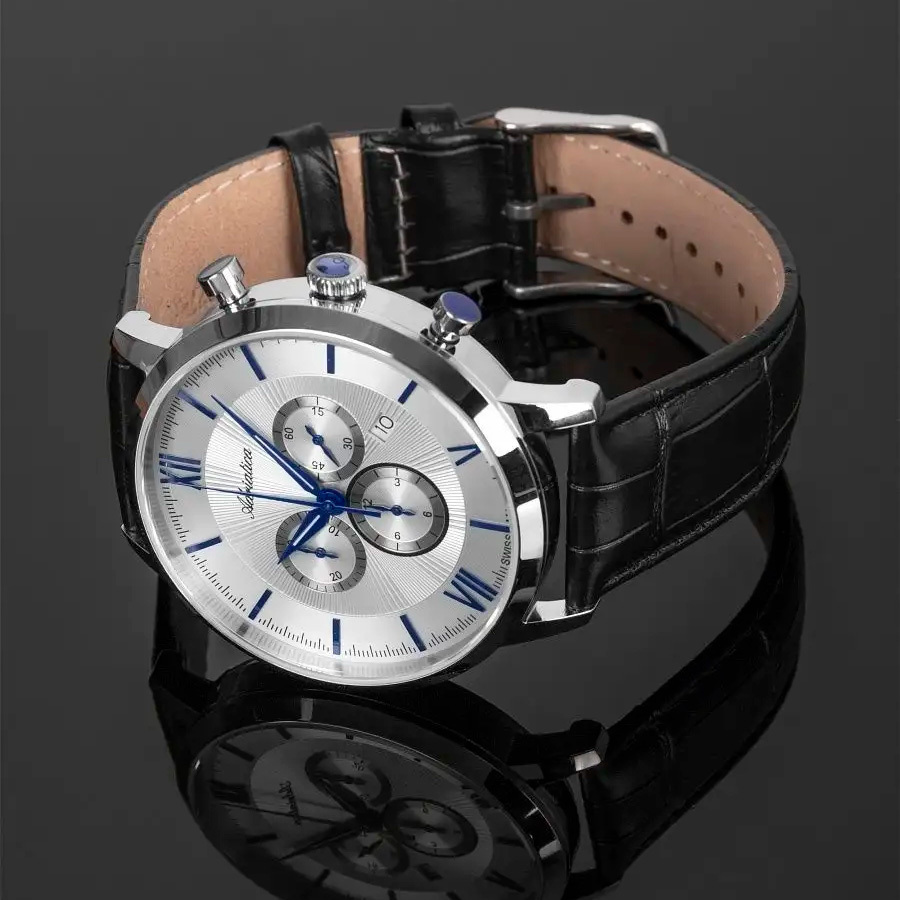 Функции: Центральные часовая и минутная стрелки, секундная стрелка вынесена на отдельный циферблат. Дата. Хронограф.