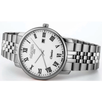Корпус: Высококачественная нержавеющая сталь, марки 316L. Белый циферблат. Стальные стрелки и чёрные римские цифры. Сапфировое стекло с антибликовым покрытием. Рифлёная заводная головка с логотипом марки «Roamer». Диаметр: 40 мм. Водонепроницаемость: 30 м.